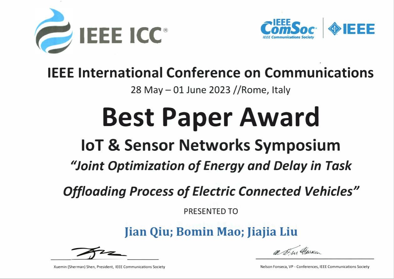 刘家佳教授团队的研究成果“Joint Optimization of Energy and Delay in Task Offloading Process of Electric Connected Vehicles”在众多论文中脱颖而出,获得了本次大会最佳论文奖。该论文漫蛙漫画
