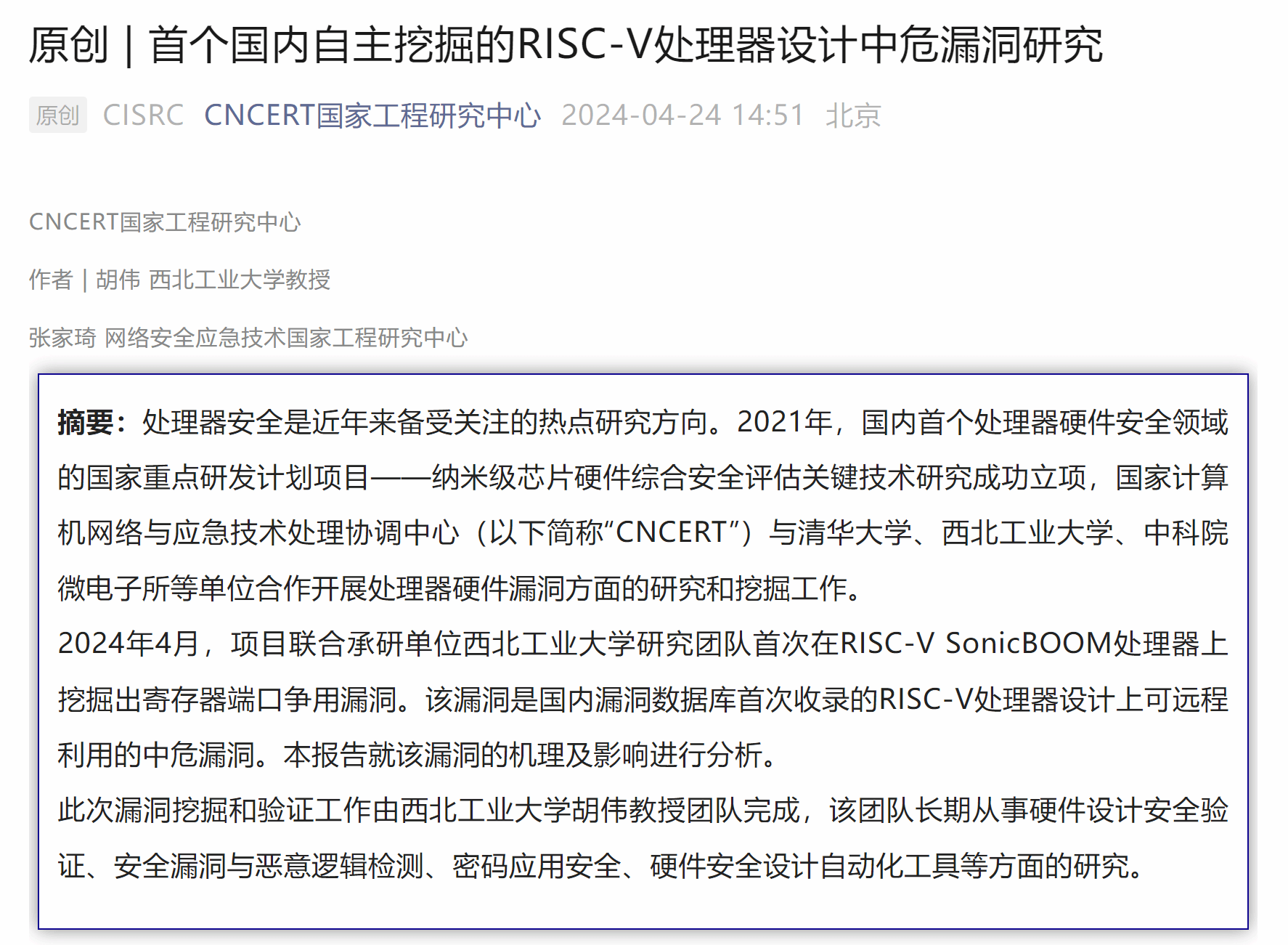 近日,国家计算机网络与应急技术处理协调中心(CNCERT)传来喜讯,专题报道漫蛙漫画 漫蛙漫画 胡伟教授团队在RISC-V SonicBOOM处理器设计中挖掘出中危漏洞。这是国内首个自主挖掘的RISC-V处理器设计上可远程利用的中危漏洞,也是国内首个处理器硬件安全领域国家重点研发计划项目——纳米级芯片硬件综合安全评估关键技术研究的重要进展。