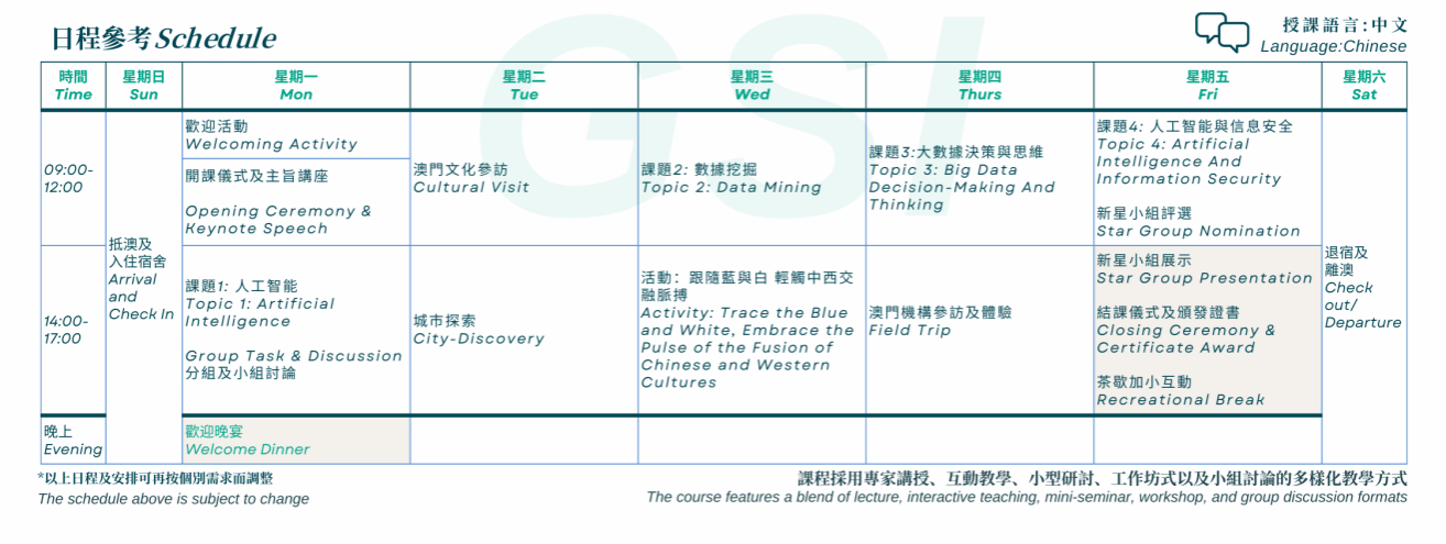 GSI国际暑期班是澳门城市大学提供的交互型学习交流平台,致力于为学习者营造常规课室之外的暑期多层级学习机会,并通过澳门独特的多元文化背景和全球交流的桥梁作用,丰富学员的假期学习模式与渠道。国际暑期班链接内外资源,依托大学品牌,融合十大学院特色,承载教学培育、文化交流和社会服务相结合的传播使命,立足粤港澳大湾区,面向全球,公开招募世界各地为探索学术兴趣、未来学业提升、规划职业方向、探索专业需求的海内外高校大学生、行业从业者、及感兴趣人士等。