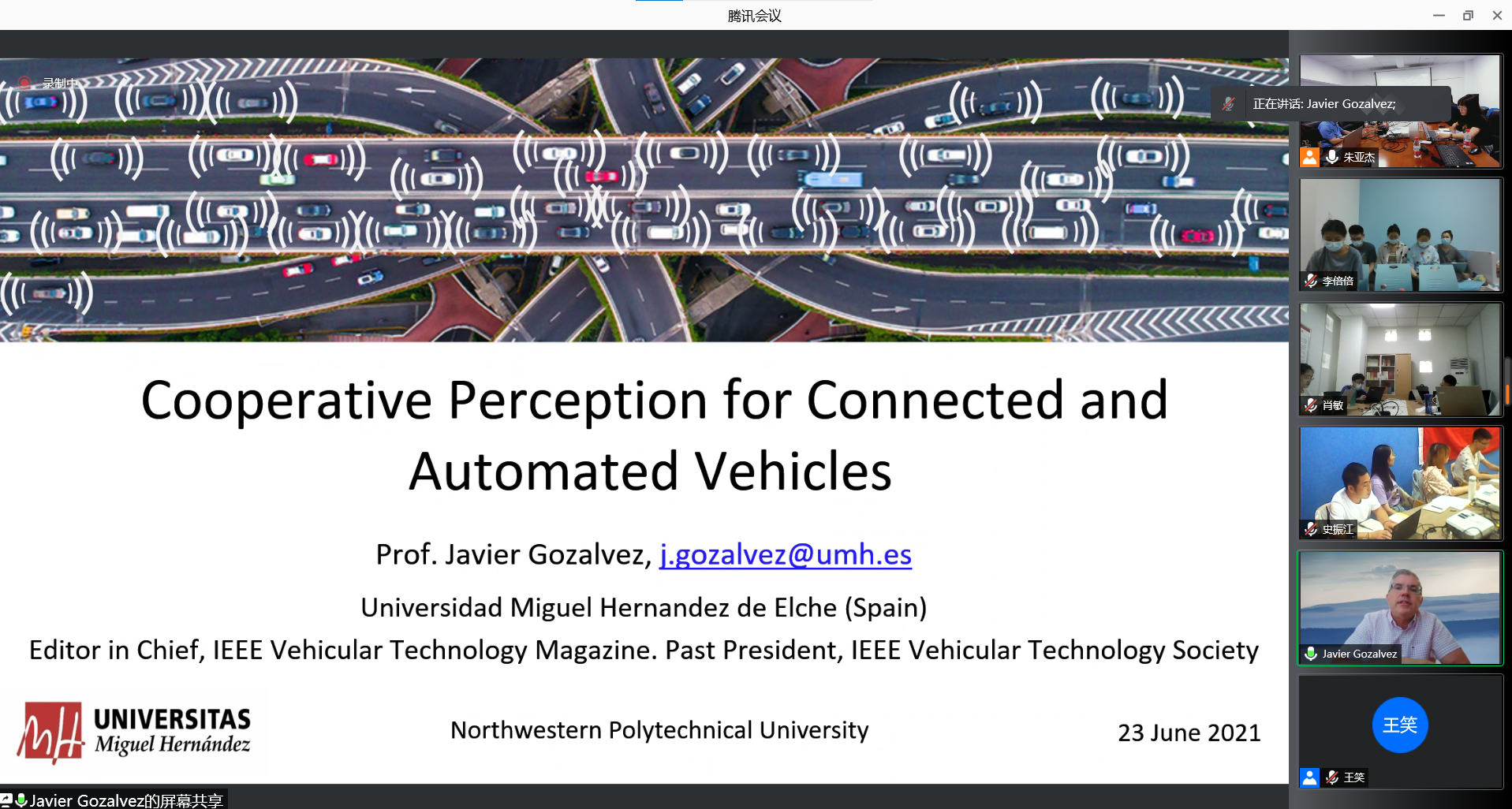 6月23日,Dusit Niyato教授以Reliable Federated Learning for Mobile Networks为题、Tolga M. Duman教授以Federated Learning over Wireless Channels为主题、Abderrahim Benslimane教授以Internet of Vehicles: Monitoring and optimization challenges for Security issues为主题、Javier Gozalvez教授以Cooperative Perception for Connected and Automated Vehicles为主题、于银菠副教授以Systematical Verification of Concurrent Trigger-action IoT Systems为主题、王曲北剑副教授以UAV-enabled Internet of Things为主题、毕红亮老师以Research on Behavior Recognition Technology Based on Wearable Device为题、蔡文静老师以Disturbance rejection and tracking control for quadrotor UAVs based on equivalent-input-disturbance approach为主题分别作了学术报告。此外,与会专家与参会人员就智能通信研究领域内的问题进行了讨论和交流。