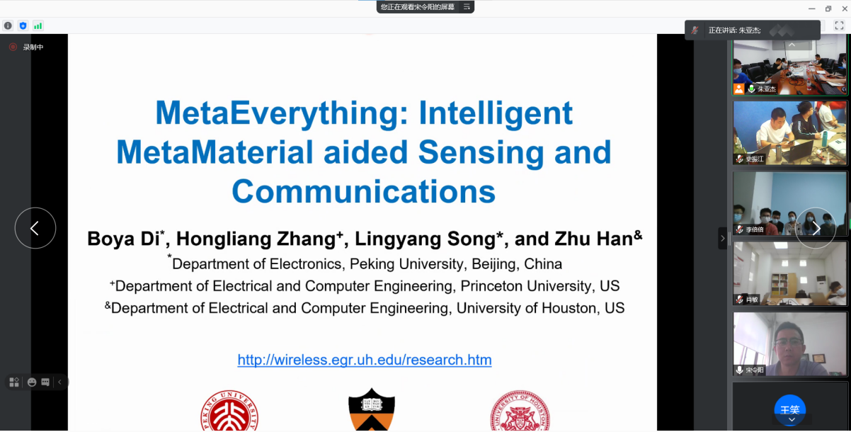 6月24日,宋令阳教授以智能超材料辅助感知和通信为题、郭嵩教授以Edge Learning: Theory, Algorithm and System Design为题、李洪伟教授以数据安全为题、陈彩莲教授以工业网络系统的分布式感知与协同传输为题、盛敏教授以Aerial Computing: Enhancing Air-to-Ground Coverage for Next Generation Wireless Networks为题、毛伯敏教授以A Study on Deep Learning-based Routing for Intelligent Traffic Control为题、郭鸿志副教授以Trajectory Optimization and Resource Allocation in Air-Ground Integrated Networks为题、徐赛副教授以Intelligent Reflecting Surface Empowered Space-Air-Ground Integrated Network为题、赵波副教授以Random Access Techniques in IoT-Oriented Satelite Networks为题、分别作了有关领域的学术报告。与会人员就智能通信安全等问题进行了交流与讨论。
