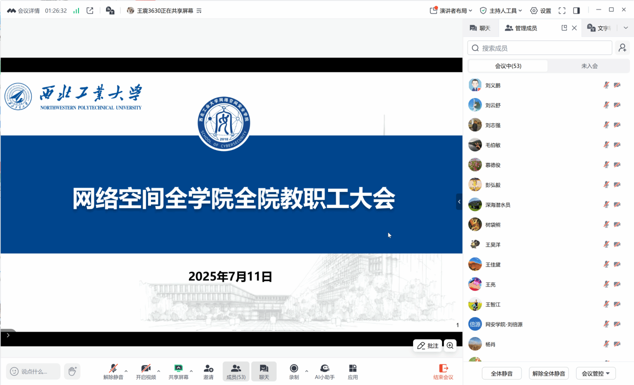 以线上形式召开了全院教职工大会。此次会议总结了学院上半年工作进展并传达学习学校2025年上半年工作总结会、警示教育会、校党委书记李言荣专题党课精神,对学院暑期工作和下学期重点工作做出全面安排,学院全体教职工参加了会议,会议由学院党委书记张文涛主持。