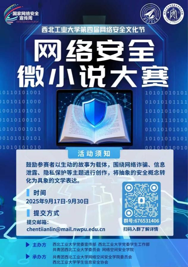 第四届网络安全文化节期间将举办“网络安全微小说大赛”,面向所有热爱故事创作、关注网络安全的师生发出邀请。
