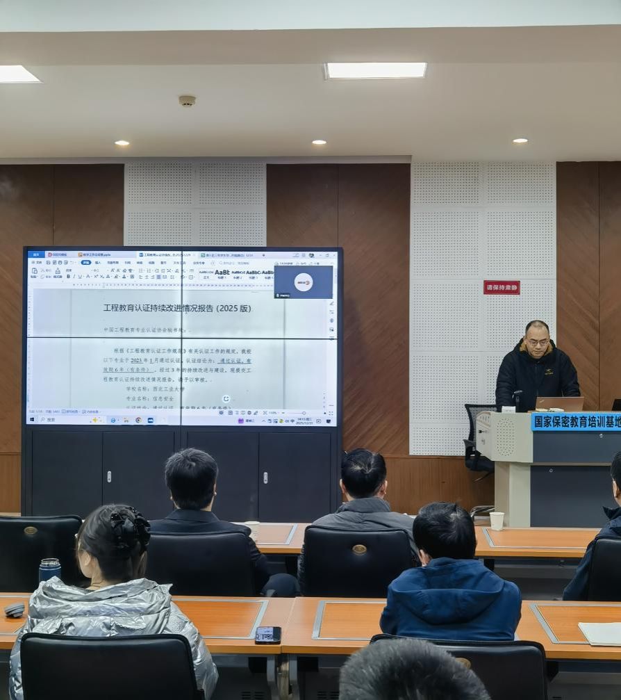 会上,院长助理张慧翔就信息安全专业认证中期审查工作做了专题汇报与详细部署。他系统介绍了认证中期审查的具体要求、时间节点与关键指标,对照认证标准,对当前教学文档规范、持续改进机制、学生成果评价、支撑材料整理等各项任务进行了精细化梳理与分解,明确了责任分工与完成时限。他要求相关教师应高度重视此项工作,以评促建、以评促改,确保高质量通过中期审查,推动专业建设内涵式发展。