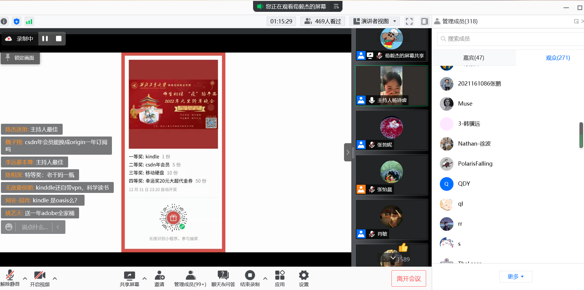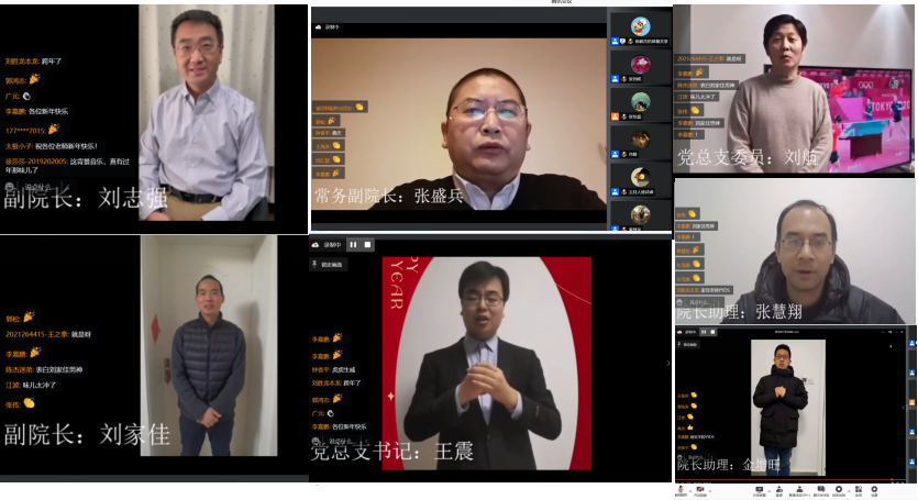 22:00全院师生在线参加了师生相伴“疫”路平安2022年元旦跨年晚会,会上常务副院长张盛兵带领大家回顾了2021年学院取得的一系列成绩,鼓励全院师生齐心协力,攻坚克难,战胜疫情,开启2022年美好新篇章。