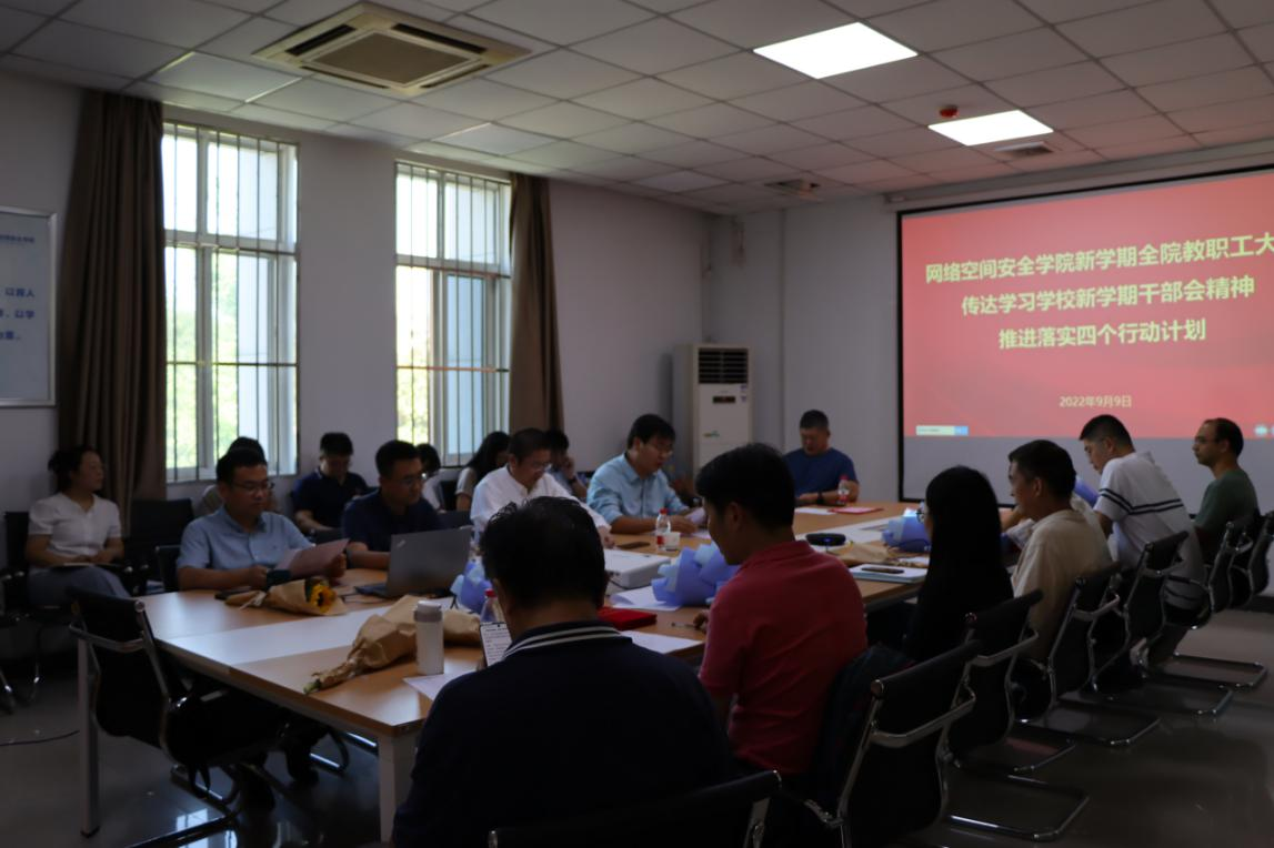 王震强调了张炜书记关于抓好落实的指示,并传达了近日程基伟常务副书记来学院调研的讲话精神。全院教职工要提高政治站位,深刻认识网络安全工作的极端重要性,抓住网络安全发展的历史机遇,以一流示范网安学院建设为目标,切实增强网络安全人才培养的责任感和使命感,进一步深入学习贯彻习近平新时代中国特色社会主义思想,做好政治引领和思想引领,用一流党建引领一流学院发展,新学期学院要重点围绕落实四个行动计划开展工作,深入分析学院内在问题,找准学院发力点,优化改进常规工作,抓紧补齐短板工作,聚焦特色优势工作,形成学院的行动计划。