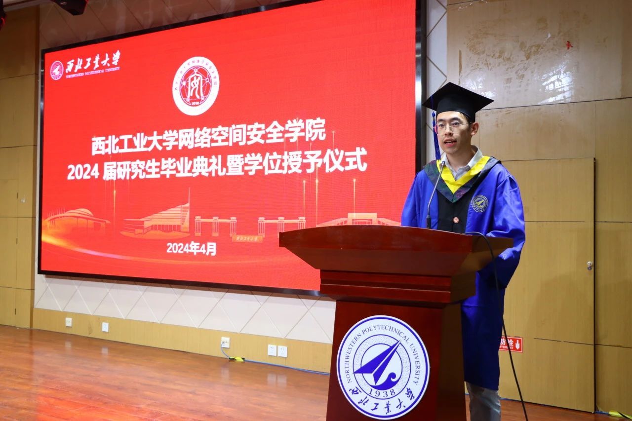 毕业生代表蒋佳琪代表全体毕业生向精心培养大家的母校、学院、老师、家人和朋友致以最衷心的感谢。他说,在西工大的七年里,见证了学校尤其是网安学院的飞速发展,他从一名稚嫩的少年蜕变成一名即将走上金融安全领域的卫士,学院的培养让他受益终生。祝福同学们愿此去前程似锦,再相逢依然如故。