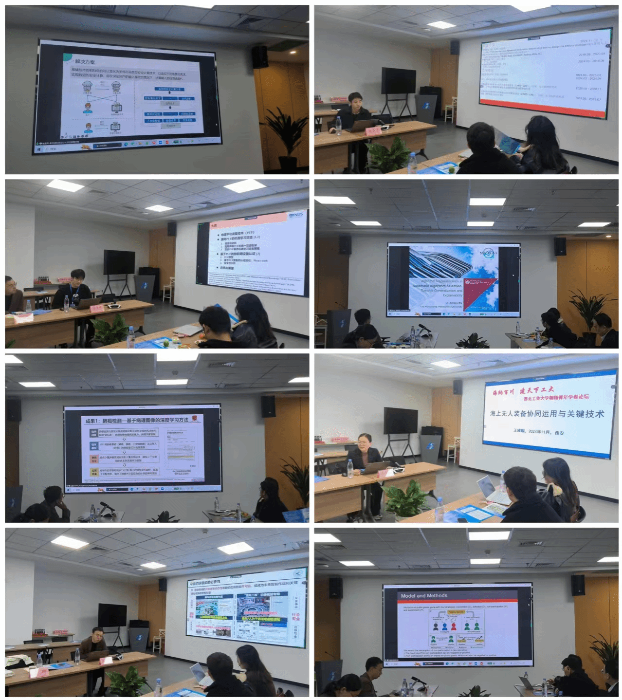 接着10名海内外学者分别进行了学术交流和分享。英国提赛德大学(Teesside University)博士后研究员宋曌作题为《自愿参与抑制公共物品博弈中利他性惩罚的涌现》的报告、香港城市大学博士后王鹏作题为《开放动态环境下的可信边缘智能》的报告、新加坡科技设计大学博士后杨雅希作题为《隐私集合计算技术及其在数据流通中的应用》的报告、中船系统工程研究院任高级主管工程师王璀璨作题为《海上无人装备协同运用样式及关键技术》的报告、美国斯坦福大学、香港中文大学作博士后王茜作题为《基于多实例半监督深度学习的医学图像分析》的报告、香港理工大学数据科学与人工智能系博士后研究员吴兴宇作题为《向可泛化与可解释的自动算法选择》的报告、新加坡国立大学电气与计算机工程博士费泓铭作题为《面向混合PUF的最优机器学习攻击》的报告、巴黎理工学院博士黄炜作题为《在多租户环境下基于Qos保障的优化问题》的报告。参会师生和学者进行了深入的交流研讨。