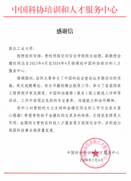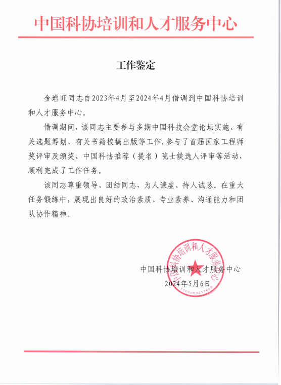 图5中国科协培训和人才服务中心发来的工作鉴定和感谢信