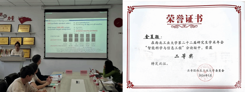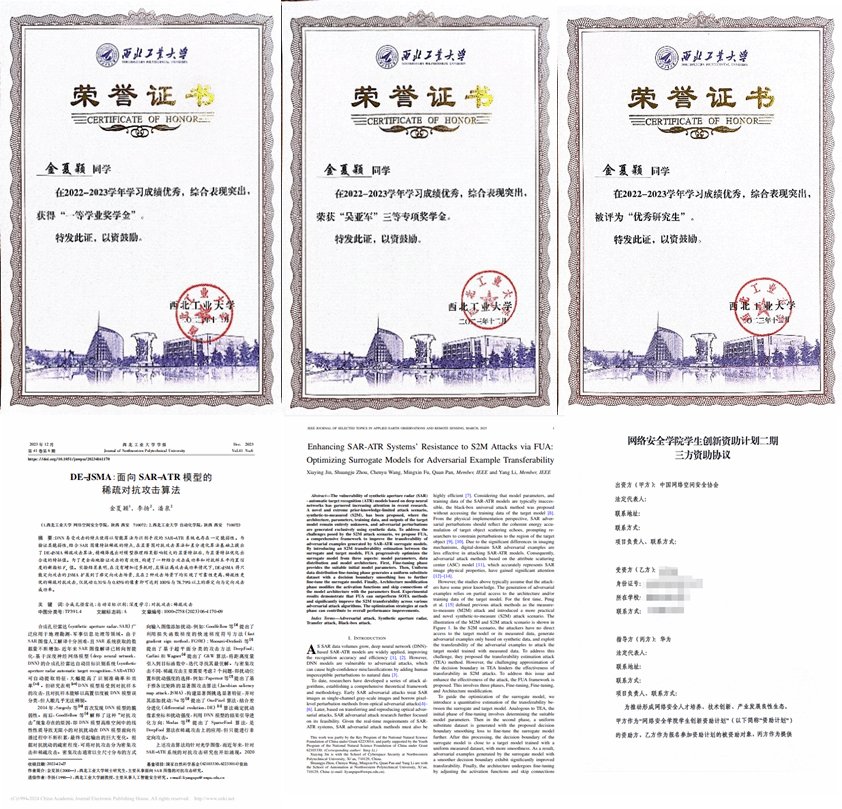 学生第四党支部宣传委员兼纪检委员。研究方向为面向SAR图像目标识别算法的对抗技术,硕士期间以第一作者发表高水平论文1篇,作为项目负责人主持网络安全学院学生创新资助计划项目1项,获各类奖学金2次,获优秀研究生、学生党建先进个人等荣誉称号7次,参加“互联网+”等各类竞赛获奖4次。
