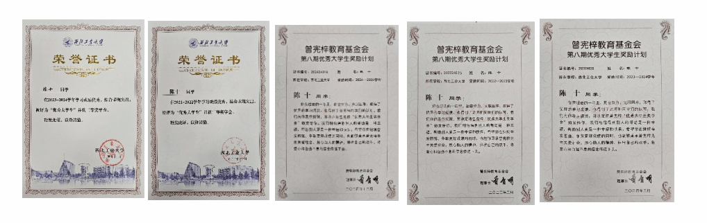 “生活有时不尽完美,但我始终相信:以中有乐,逆境亦可前行。”本科四年,面对生活的波折与现实的考验,陈十从未被困难击倒。在学院的支持与个人的不懈奋斗下,他不仅保持了优异的学业成绩,还顺利通过奖助学金与生活补助,覆盖了四年的基本生活支出,走出了一条坚实的成长之路。
