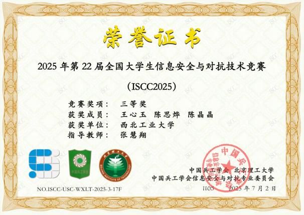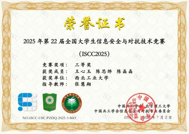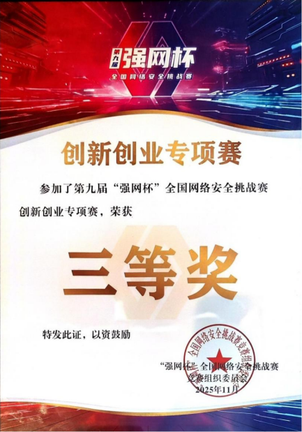 科研竞赛中,她敢于探索、勇于突破,将理论知识转化为实践能力,主动投身科研探索,参与大学生创新训练计划项目,入选省级大创。在各类学科竞赛中,她更是迎难而上,与团队成员并肩作战,获得全国大学生信息安全与对抗技术竞赛国家三等奖、“强网杯”创新创业专项赛三等奖。