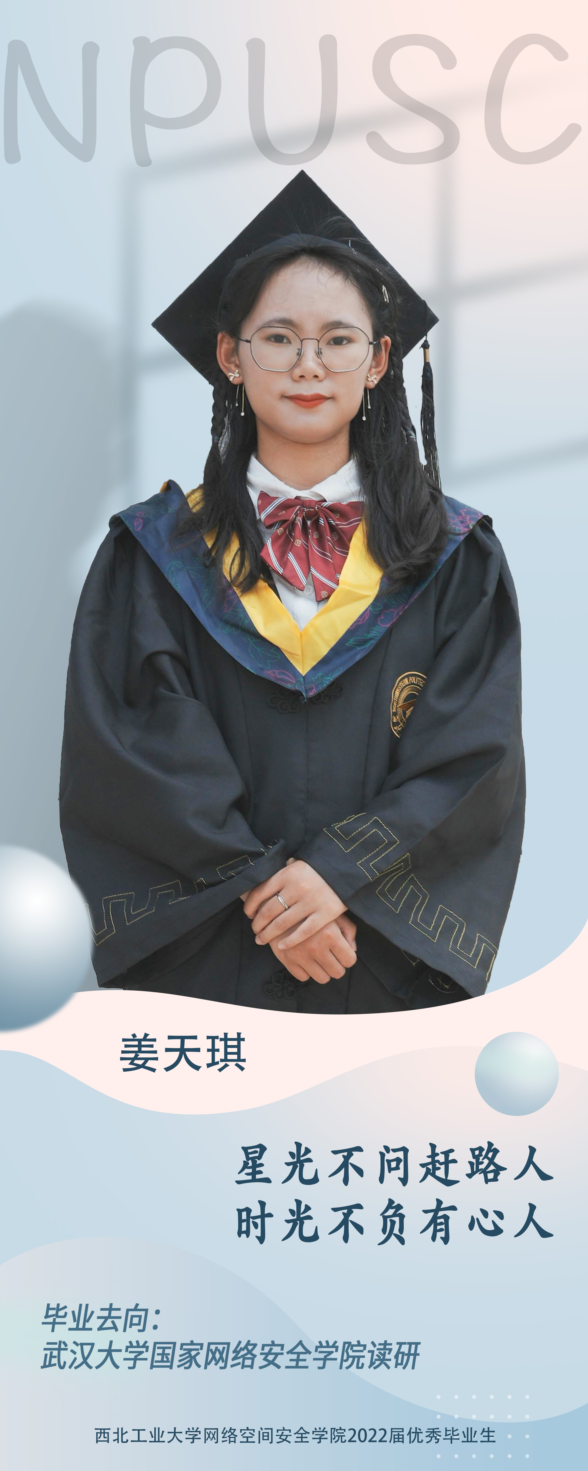 学院2018级本科生姜天琪。学习上,她态度端正勤奋好学,目标明确学习热情高。在努力做到学好专业知识的同时,还涉猎其他方面的知识,最终也取得了优异的成绩,连续三年获得院优秀奖学金。学习之余,她还爱看各种文学类书籍,想要由此提高自己的思想境界。生活上,她一直保持着“走一步,停下来,思考一番,再继续走,稳扎稳打”的生活态度。乐观向上,踏实务实是大多数人对她的评价。本科期间曾担任学生会副部长。曾获得院优秀学生、漫蛙漫画
