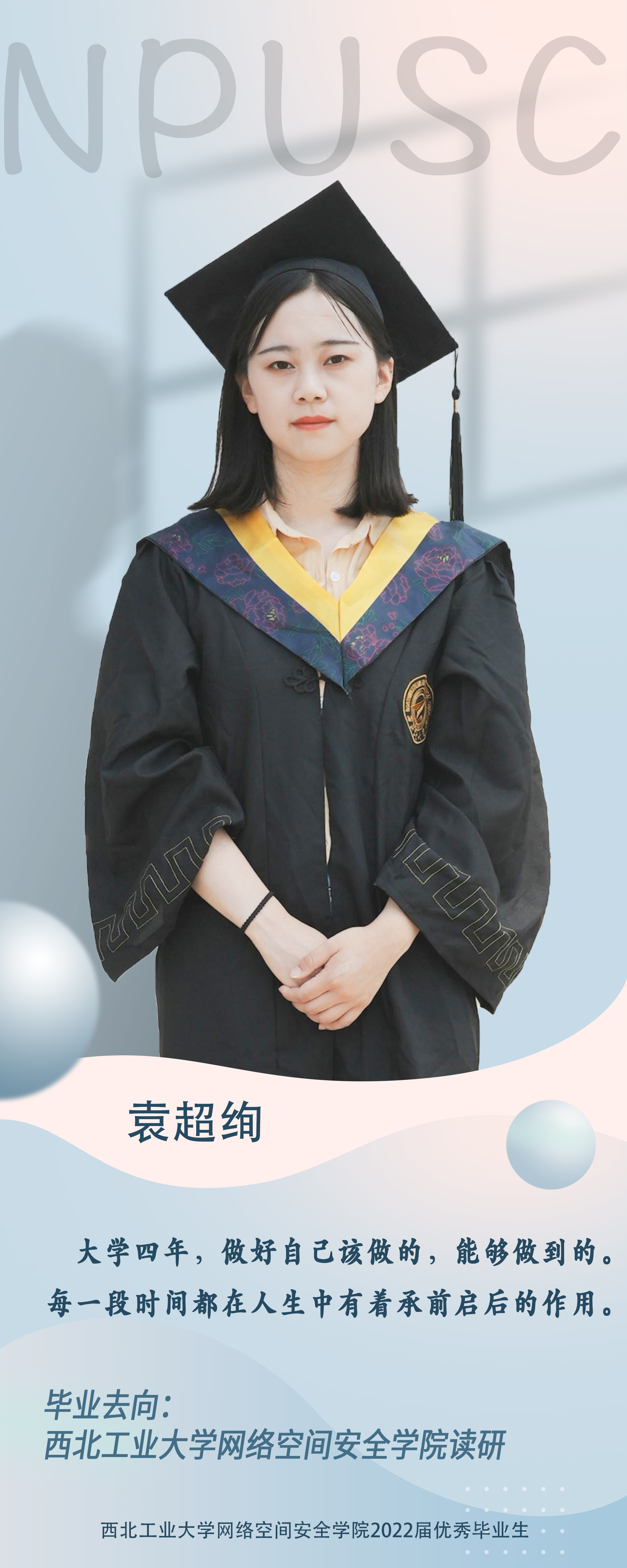 学院2018级本科生袁超绚,连续四年担任班级心理委员;曾获三次院优秀学生奖学金;获得陕西高校第十二次大学生高等数学竞赛二等奖,第一届漫蛙漫画 太仓杯二等奖,第十四届全国大学生信息安全竞赛三等奖;大四时参加漫蛙漫画 研究生招生考试以专业第一名被录取。