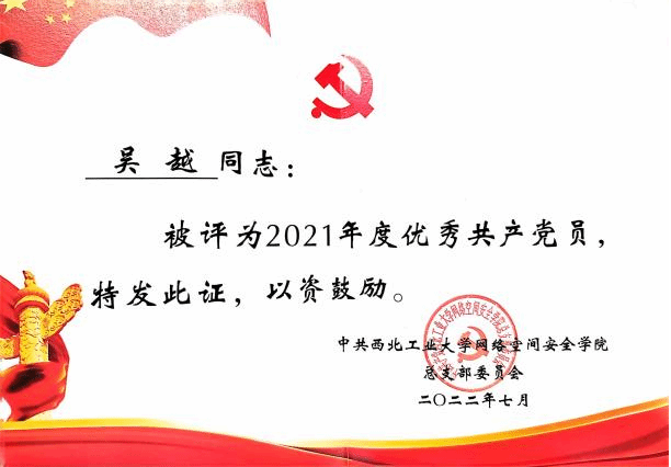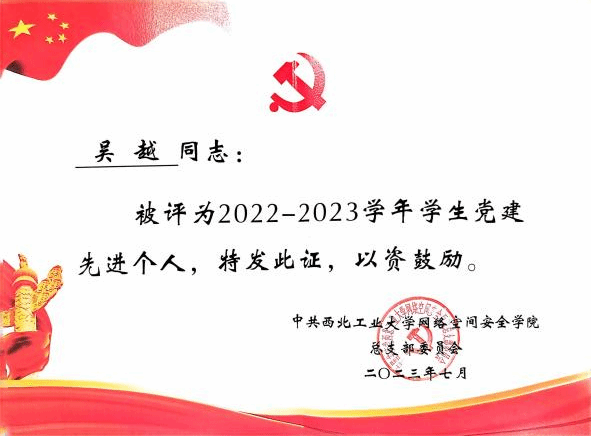 吴越始终坚持正确的政治方向,具有良好的道德修养,热爱祖国,团结同学。曾担任学院学生第五党支部支部书记,任职期间兢兢业业,身体力行,带头发挥先锋模范作用。在任职期间,他组织支部成员认真学习党的二十大报告,并邀请优秀的党员分享经验;同时举办主题演讲比赛,策划了“实践引领思想,共进伟大征程”主题活动,该活动被评为校级优秀主题党日活动。