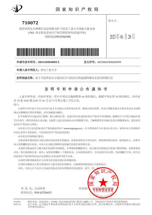 杨一哲,中共党员,网络空间安全专业,师从张秀伟副教授,是课题组中基于多源遥感图像的不规则形态目标协同语义分割研究的主要成员,研究方向为遥感图像语义变化检测。在科研道路上,杨一哲不仅刻苦钻研,不畏艰难,更展现出了卓越的创新思维和独立科研能力,以学生一作的身份,取得一篇SCI一区论文和两项公开专利。
