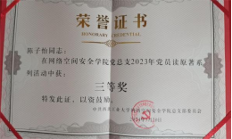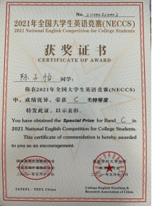 除了课程的学习,陈子怡同学在竞赛方面追逐自己的热爱,以赛促学,多维度多方面的提升能力。她大一便斩获全国大学生英语竞赛特等奖,参与全国总决赛的演讲和风采大赛并获三等奖;多次获得外研社国才杯写作阅读大赛初赛一等奖;曾获全国大学生数学竞赛三等奖。在胡伟老师的指导下,作为团队队长,她带领队员获得全国大学生信息安全作品赛二等奖,项目同时申请软著一项。