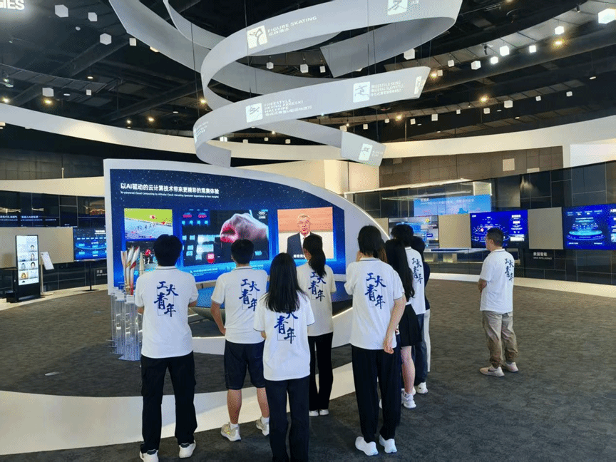 进入阿里云园区后,讲解员带领实践队参观了阿里云展厅,介绍了阿里云的漫蛙漫画和发展历程。跟随讲解员的脚步,同学们了解了阿里云以“全面拥抱AI”为特色的一系列服务产品和以“云计算推动科技创新”为指引的关键技术突破,并亲身感受了阿里云以AI驱动的云计算技术给生活带来的便捷。
