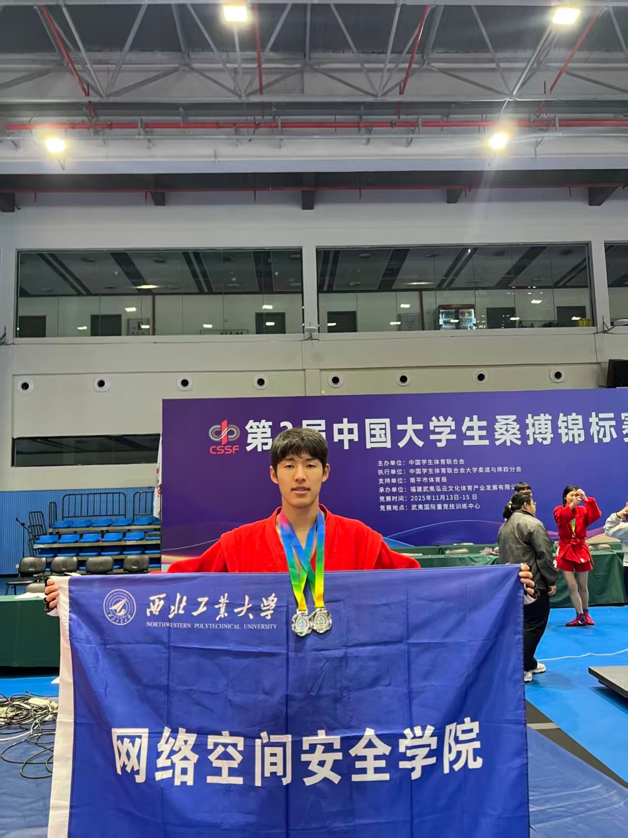 在男子71公斤级这一核心赛道上,买拉木别克一举拿下两项亚军,既彰显了其全面均衡的技术实力,更展现了西工大学子不畏强手、勇攀高峰的精神风貌。