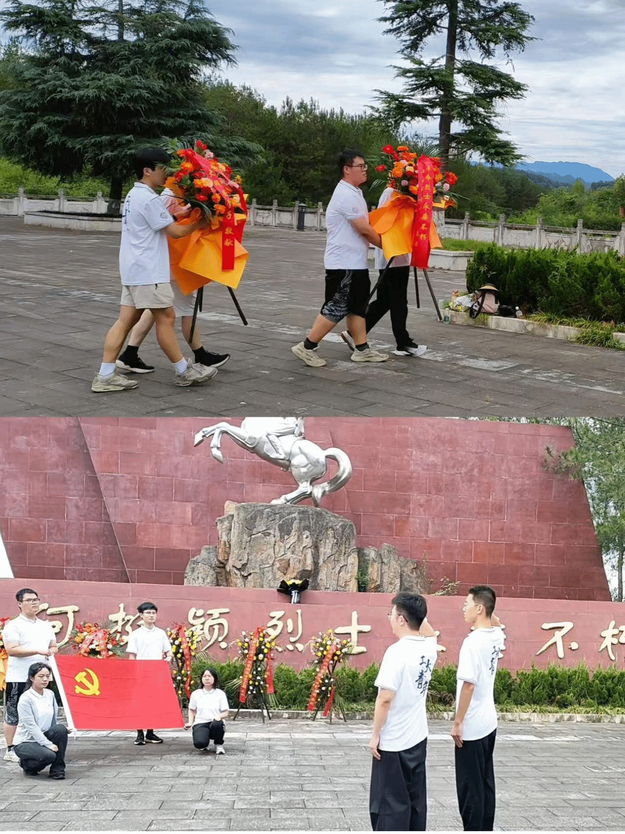 在参观完纪念馆后,实践队在何挺颖烈士雕像前举行了庄重的献花仪式。队员们手持鲜花,缓缓走向雕像,将鲜花敬献在雕像前,表达对烈士的深切缅怀和崇高敬意。在雕像前,队员们肃立默哀,追思烈士的英勇事迹和不朽精神。这一仪式不仅是对烈士的缅怀,更是对红色精神的传承和弘扬。通过这一庄严的仪式,队员们更加深刻地理解了革命先辈们为国家和人民所做出的巨大牺牲,也更加坚定了继承和发扬革命精神的决心。