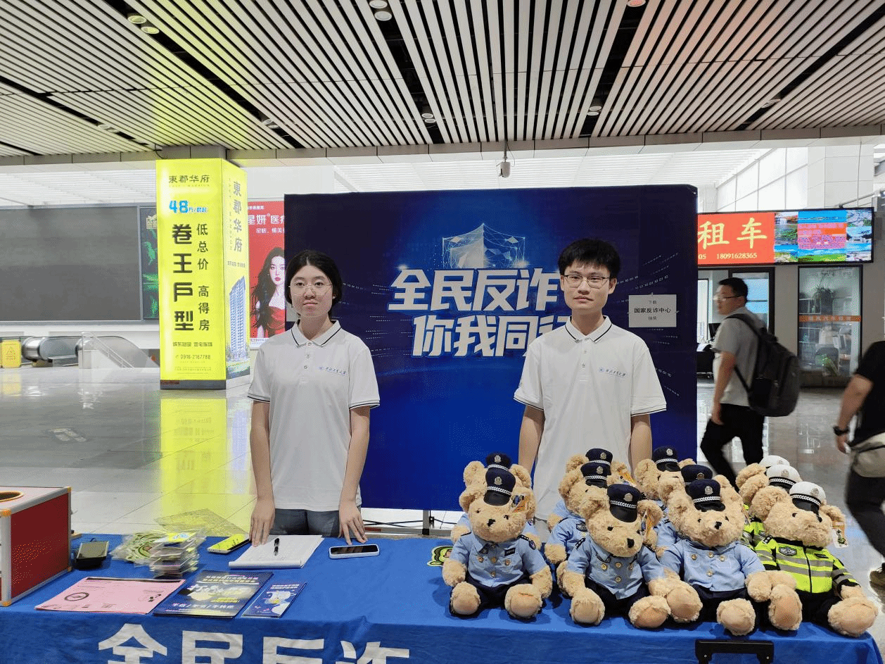 早上,实践队抵达汉中市火车站,准备开展反诈宣传活动。实践队员们迅速布置好宣传场地,摆放好宣传资料,准备迎接来往的旅客。队员们向过往旅客发放宣传手册,详细讲解电信诈骗的常见手段和防范方法,并通过现场演示,展示诈骗分子的套路,提醒大家提高警惕。队员们还利用海报上的案例,向旅客们普及反诈知识,引导大家下载国家反诈中心APP。