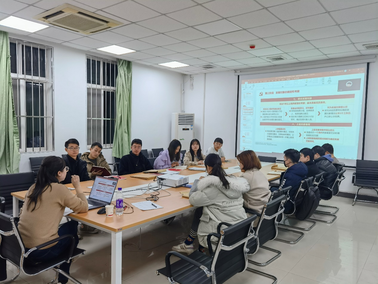 麻美龄老师首先强调了党员发展流程的重要性、讲解了开展发展党员工作的政策依据。紧密结合《中国共产党发展党员工作细则》和《中国共产党普通高等学校基层组织工作条例》,她从入党积极分子的确定、入党积极分子的培养教育和考察、发展对象的确定和考察、预备党员的接收、预备党员的教育考察转正五个阶段二十五个程序详细讲解了入党流程。她反复强调,从申请人到正式党员是一条不平坦的道路,需要有坚定的信念、坚强的意志、信心和勇气,更需要自身的不断努力。麻美龄老师对党员发展流程的每个环节重点需要注意的细节、时间节点、满足条件、主要程序等进行了详细分析,同时也对基层党支部十项组织生活制度进行了宣讲。