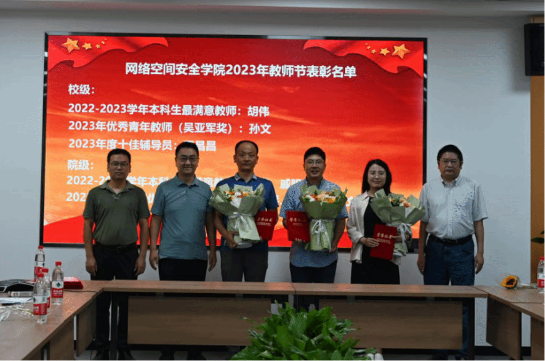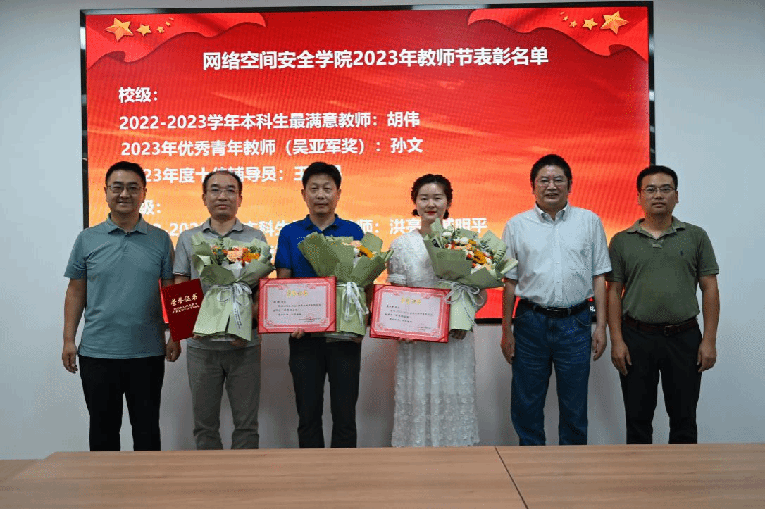 接着举行教师节表彰。张盛兵副院长在大会上致辞,向学院全体教职工致以节日的问候。他表示,学校“双一流”建设、学院的发展壮大,离不开每位老师的辛勤耕耘,学校和学院的荣誉和地位,离不开每位老师在工作中投入的热情与智慧。教师节表彰是学院一笔无形和无价的宝贵财富,也体现着学院尊崇师道的文化理念,希望通过这样的活动,能够让获奖教师有一种荣誉感、更有一种网安人的仪式感。当前,学院正处在申报一流示范网安学院的紧要关头,面临的机遇与挑战前所未有。逆水行舟,不进则退,全体教职工唯有更加勇敢地担当,更加勤奋地工作,才能为学校、学院赢得更好更快的发展机遇。